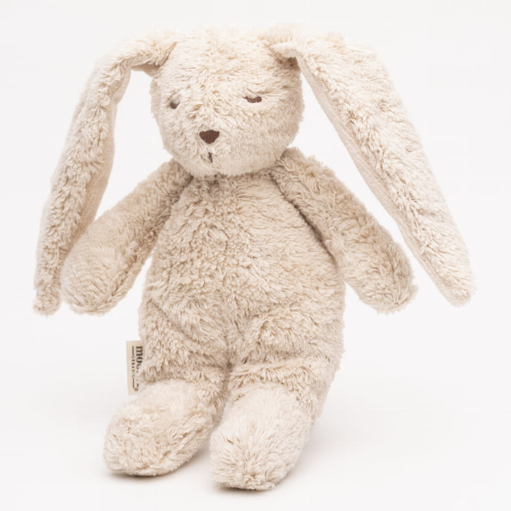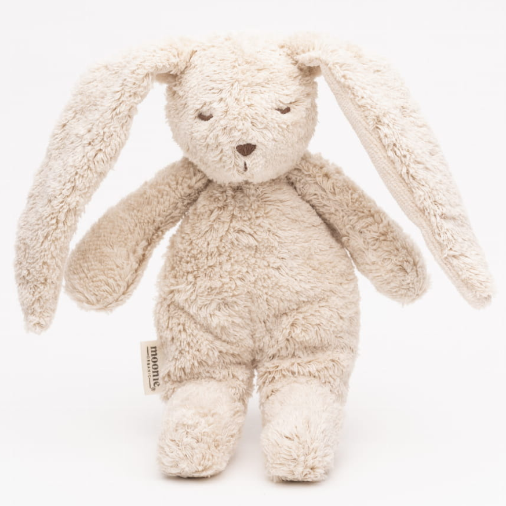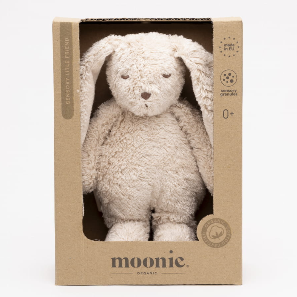 La marque Moonie a utilisé des matériaux sûrs et tactiles - coton biologique et rembourrage doux - pour que le jouet convienne également à la peau sensible des bébés.