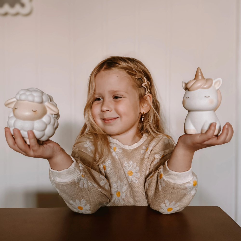 La collection Mme Ertha comprend quatre adorables figurines : un mouton, une licorne, un hérisson et un lapin.