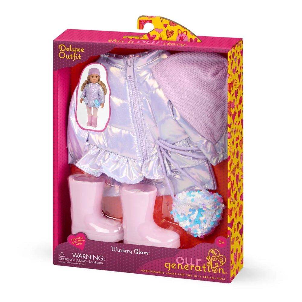 Our Generation Ensemble de vêtements pour poupées avec veste en duvet brillante et sac à main à paillettes