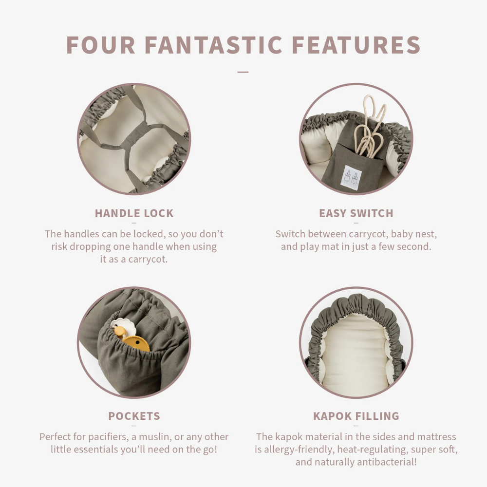 Ce produit innovant 3 en 1 fonctionne comme un cocon confortable pour bébé, un porte-bébé portable et un grand tapis de jeu lorsque les côtés sont détachés.