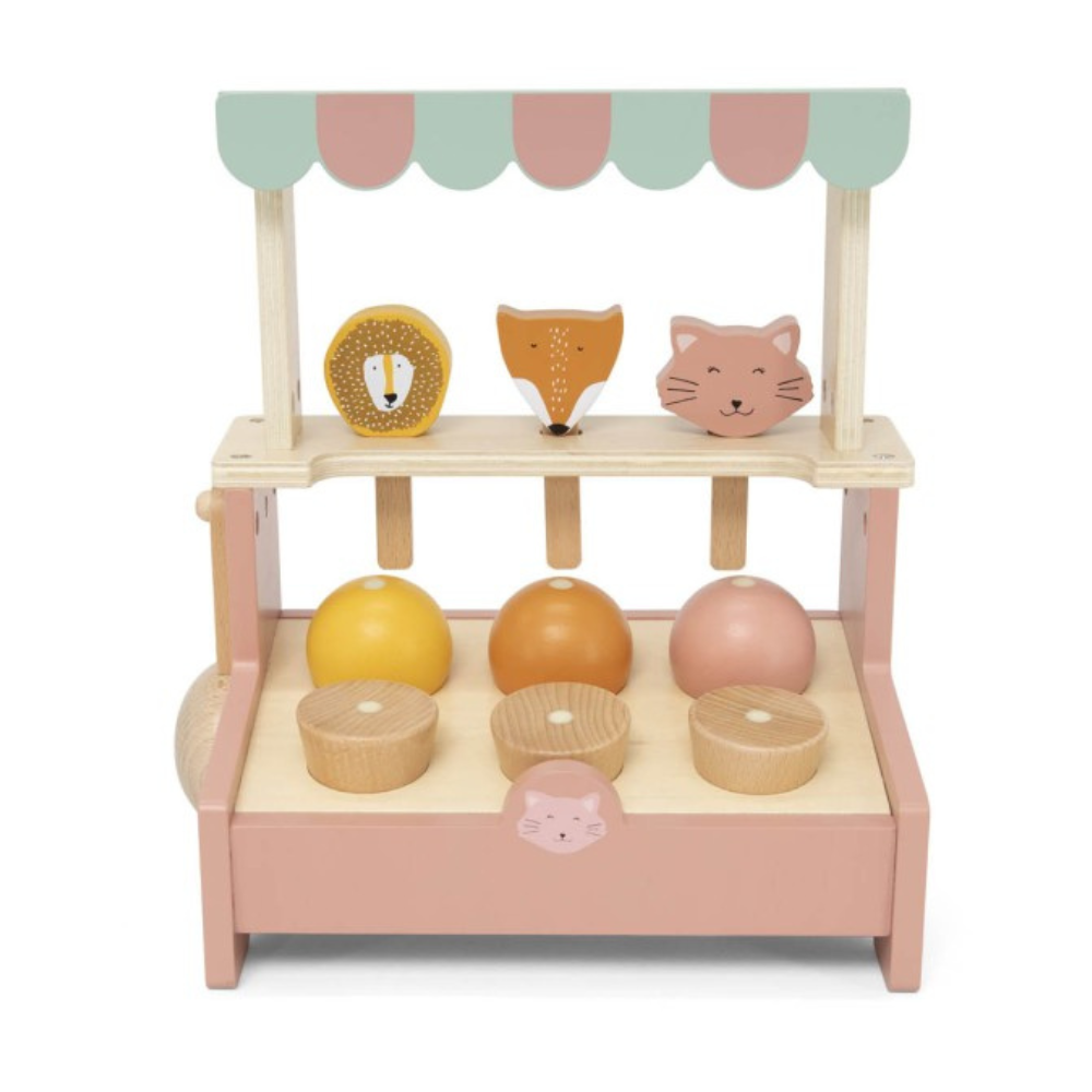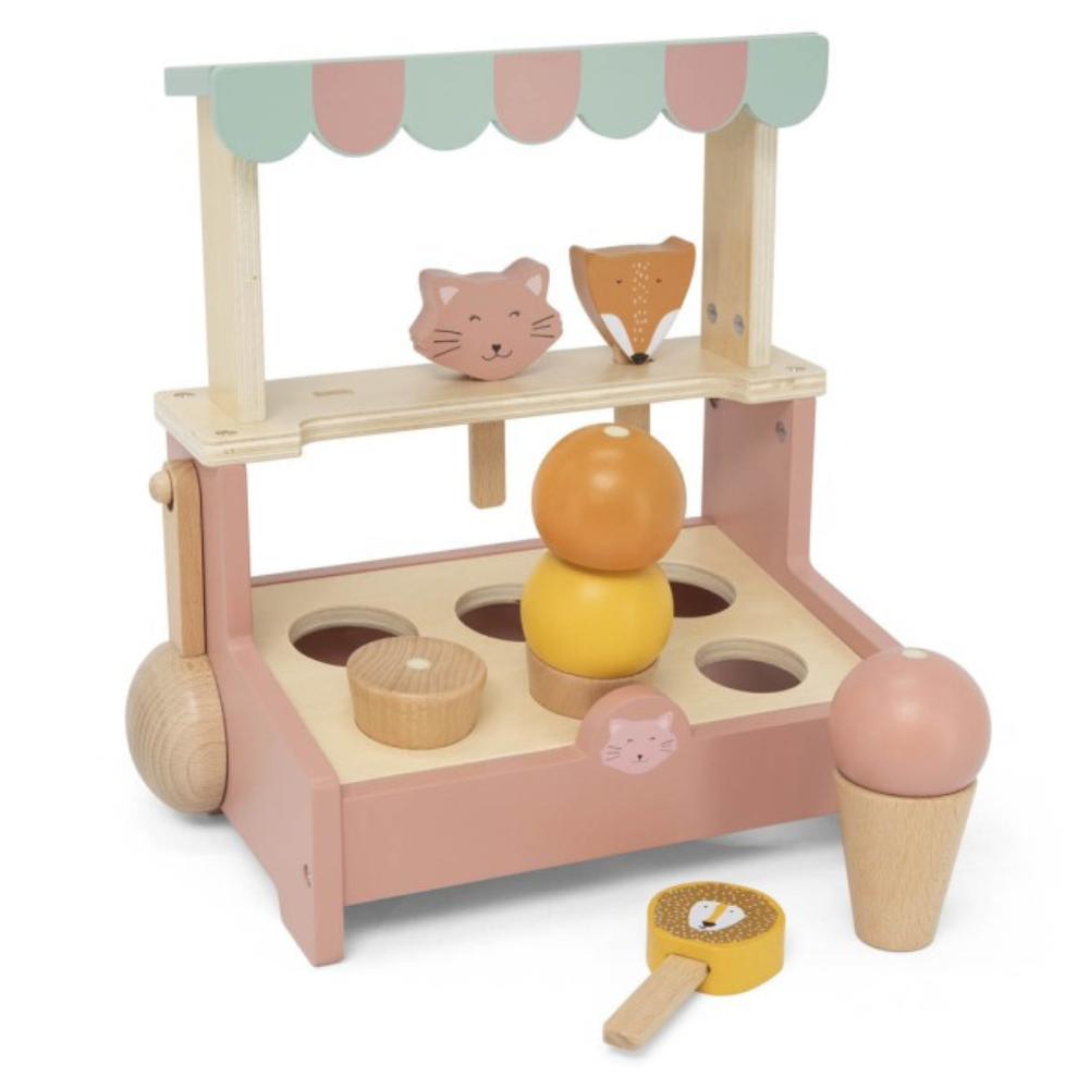 Grâce à son format pratique, le manège à glaces en bois est idéal pour la maison et les voyages, et les accessoires tiennent facilement dans les mains d'un enfant de trois ans.